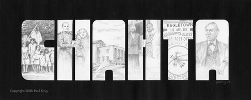 Family heritage is depicted using a cut mat of the letters to showcase the individual illustrations. The first letter C shows the artist’s mom, uncle and aunt while attending Vacation Bible School in 1933. The H pictures the artist’s great grandmother and great aunt. A is the artist’s birthplace, the Talihina Indian Hospital, Indian Health Services, in 1949. Letter H is grandpa and grandma Dyer on the church steps. T frames the Choctaw seal and an Eagletown sign which represents where the Dyer-King family originated. The final A focuses on the artist’s great grandfather, James Dyer, who help build the Gardner Mansion and served the Choctaws in Washington, DC during Indian Territory days.