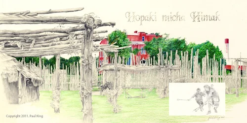 Reflections of Choctaw history and traditions from the grounds at Tuskahoma, near Talihina, provides the contrast of the re-created village and the Council House/Museum in the background. While the village was made of primarily cut trees and mud, it offered the visual difference of the construction that the Council House presented. The foreground illustrates the “then”, drawn in graphite, is a contrast of structures. The village fence allows the viewer to see the “now” which is the museum and is created in colored pencil. The stickball players in the foreground illustrate Choctaw traditions of today and involves both the “then and now” with two modern day “warriors” playing the traditional game of stickball. The Choctaw words in the sky, Hopaki maicha Himak are translated to the title Then and Now.