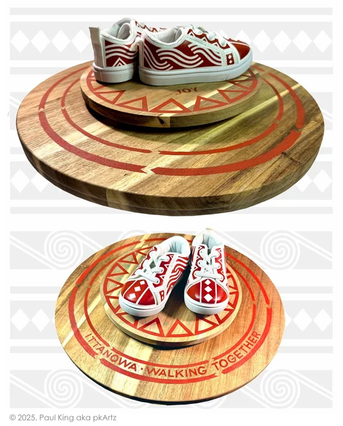 The words Ittanowa - Walking Together include generations making progress every day. From the days of forced removal of Choctaws from Mississippi to Indian Territory aka Oklahoma were the inspiration to this contemporary art piece. The infant shoes are painted with traditional Choctaw designs, with Faith and Hope on the sole inserts. Joy is painted on the resting base and the aforementioned Ittanowa painted on the Lazy Susan base to allow it to rotate.