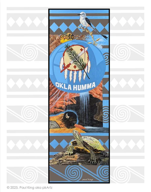 Oklahoma is nature filled, specifically native species. The Scissortail Flycatcher (bird: hushi) is beautiful and Oklahoma’s state bird; the pollinating Bumble Bee (bee: foi) bringing life to reality; the American Bison (buffalo: yvnvsh), docile unless provoked; the Red Eared Turtle (turtle: luksi) patiently living its life to the fullest. The natural waterfall symbolizes that water is life. The blue sphere with the Osage shield represents the 39 federally recognized nations thriving in Okla (people) Humma (red) which are Choctaw words.